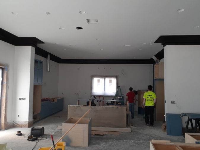 This chef-inspired kitchen embodies bold design and refined functionality, featuring rich blue cabinetry accented by brushed brass hardware for a striking visual contrast. The black-and-gold range hood stands as a dramatic focal point. At the same time, dual islands serve distinct purposes, one for meal preparation and cooking, the other for gathering, serving, and conversation, balancing performance with hospitality. A marble waterfall countertop flows seamlessly into geometric tile detailing, uniting the space with texture and elegance. Layered lighting, from starburst chandeliers to under-cabinet accents and warm overhead illumination, enhances both depth and ambiance. Just beyond, a discreet butler’s pantry adds storage and continuity. Expertly crafted and installed in Tampa Bay, this kitchen showcases luxury finishes, precision craftsmanship, and timeless Florida sophistication.